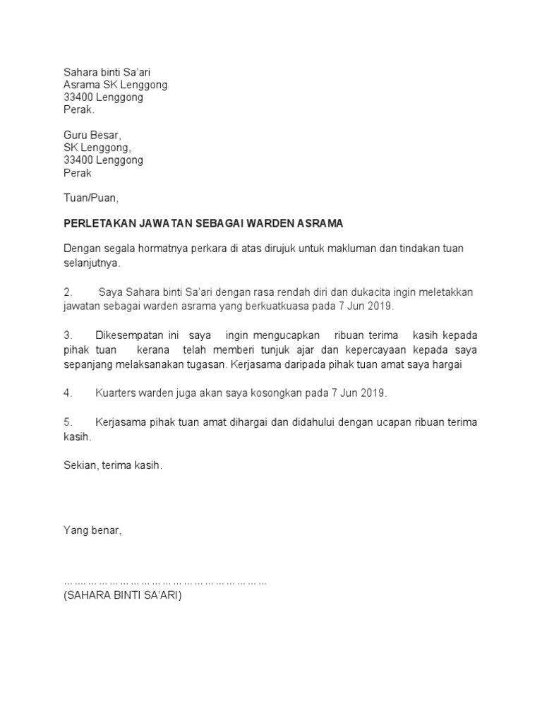 Surat Perletakan Jawatan Sebagai Warden Asrama Pdf